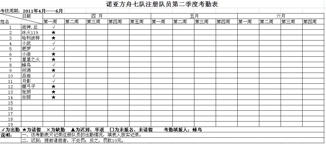 诺亚七队2011年第二季度注册队员考勤表 |