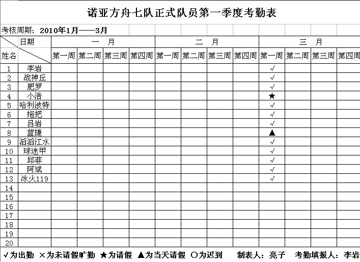 附件: 7队2010年第一季度考勤记录表.xls (2010-3-30 00:12, 29.5 KB) / 下载次数 2063