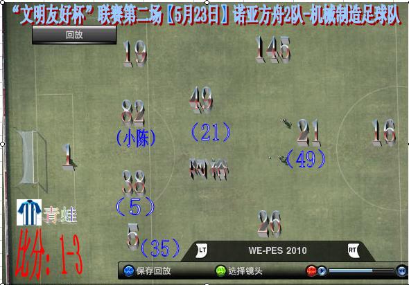 下半场开始后,针对老田的脚伤,将老田推上前腰,青蛙回到后腰,但是我们的左路进攻还是太频繁,亮子那边在体力充沛的情况下没有得到合理的利用,直到下场亮子都不累,也可能是红牛的作用。反观对手再次利用一次机会攻破我方大门,3-0领先。随后对方体力也透支,在一次非绝对的机会上,对方禁区内手球,被判点球。青蛙一蹴而就,一除上次罚失点球的阴影,扳回1球。但最终由于体力,天气,技术等各种因素,我们以1-3败下阵来。