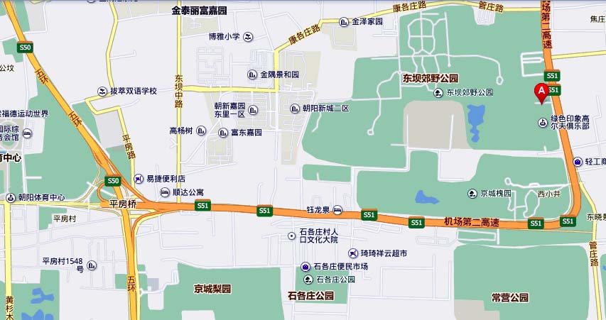 机场二通道,焦庄村出口路西“红太阳生态园”旁边或:东五环-京顺路-机场辅路-东苇路-康各庄路