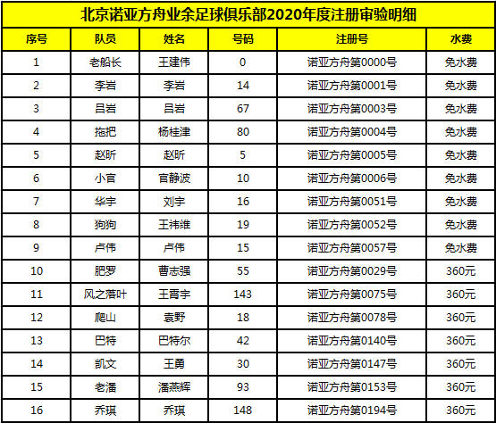 北京诺亚方舟业余足球俱乐部2020年度注册审验完毕,明细如下: