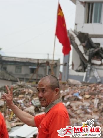 王石,请不要穿着红衣还在废墟上做V形手势!(图)