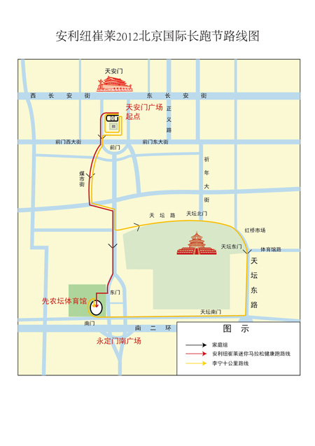 2012北京国际长跑节将于4月15日(星期日)9点举行,2万余名长跑爱好者分别参加5公里和10公里比赛。比赛起点设在天安门广场内,终点设在先农坛体育场内。
