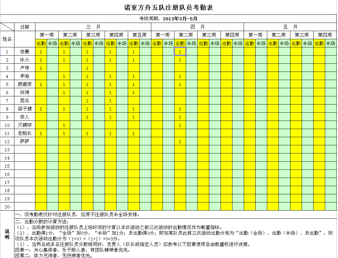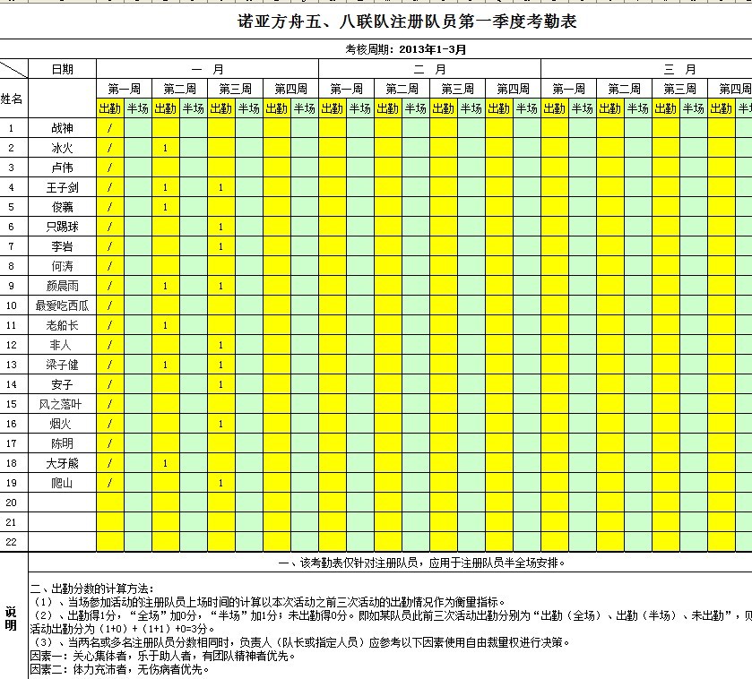 附件: 诺亚方舟五队注册队员考勤表3.30.xls (2013-4-15 15:08, 33 KB) / 下载次数 1571